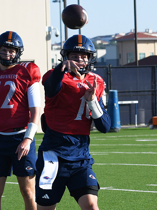 Noah Lugo going through quarterback drills at UTSA spring football practice on Thursday, April 10, 2025. – photo by Joe Alexander