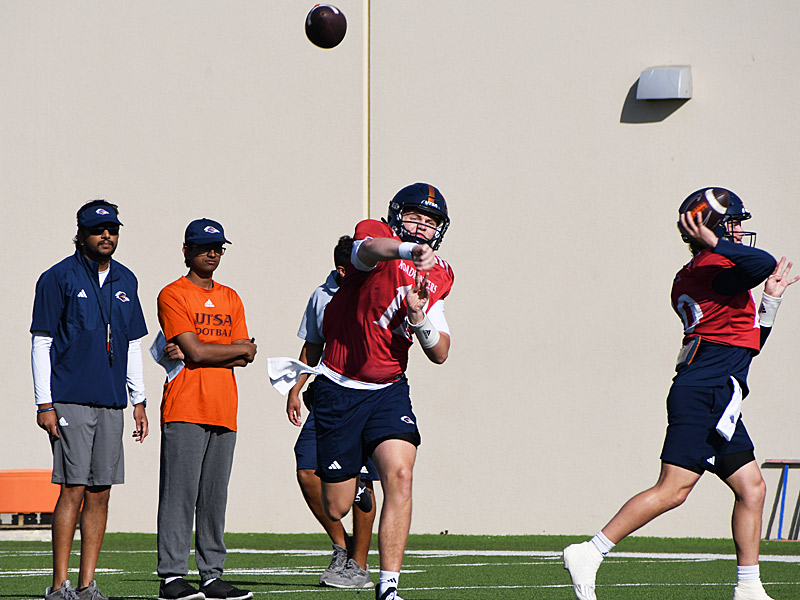 Max Gerlich going through quarterback drills at UTSA spring football practice on Thursday, April 10, 2025. – photo by Joe Alexander
