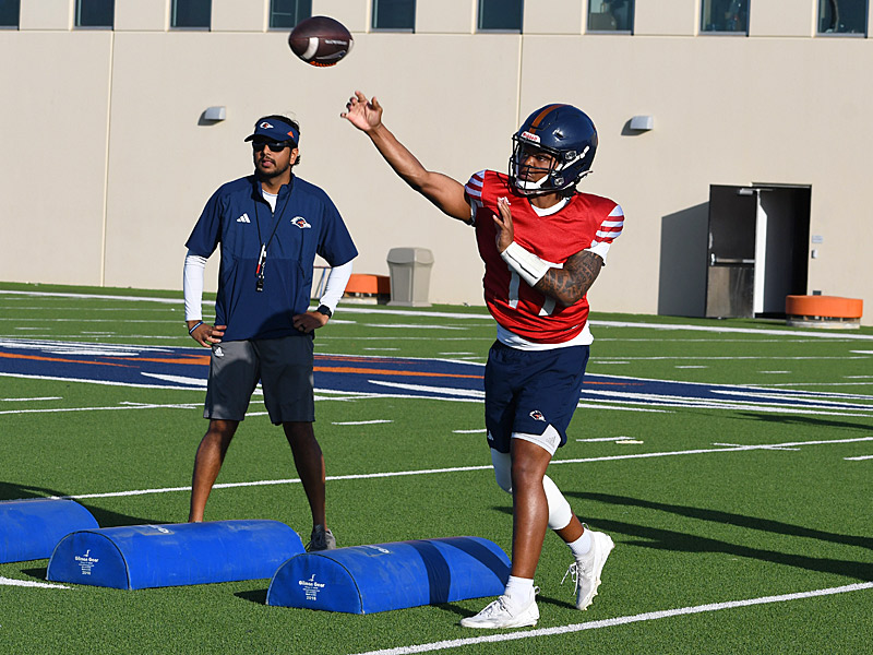 Brandon Tennison going through quarterback drills at UTSA spring football practice on Thursday, April 10, 2025. – photo by Joe Alexander
