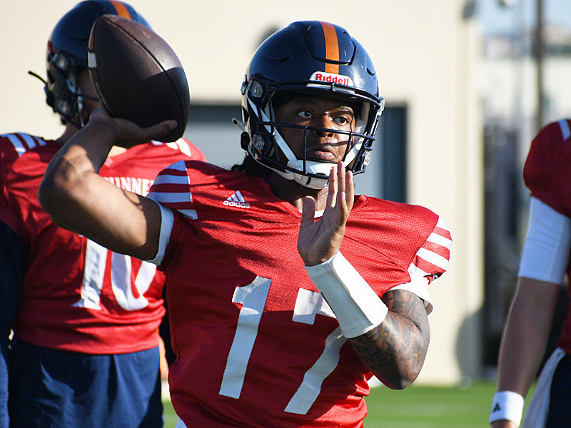 Brandon Tennison going through quarterback drills at UTSA spring football practice on Thursday, April 10, 2025. – photo by Joe Alexander