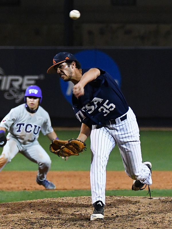 UTSA’s Jay Ward pitching against TCU on March 10, 2021, at Roadrunner Field. – photo by Joe Alexander