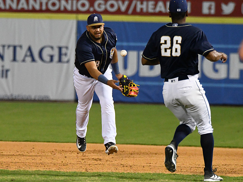 Pedro Castellanos, Edwuin Bencomo. The San Antonio Missions beat the Frisco RoughRiders 4-1 on Saturday, April 15, 2023, at Wolff Stadium. – photo by Joe Alexander