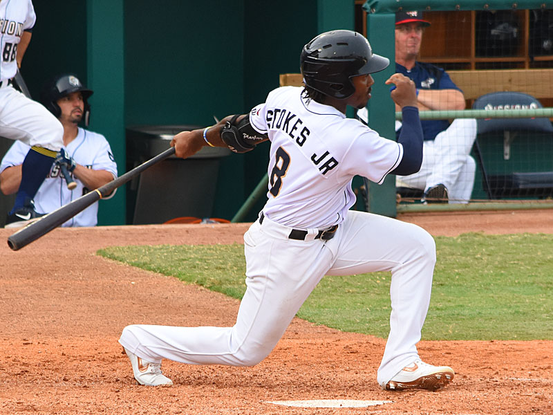 Missions outfielder Troy Stokes Jr. playing at Wolff Stadium during the 2019 season. – photo by Joe Alexander