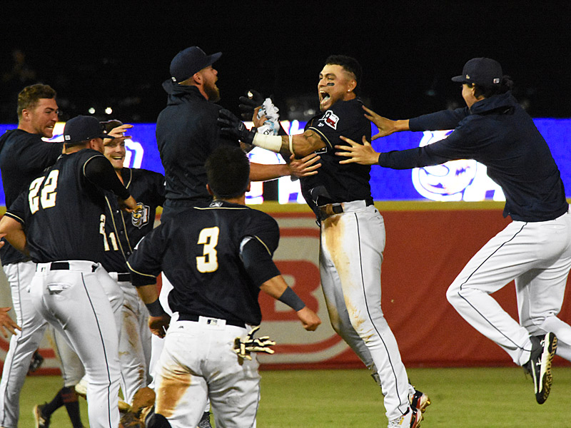The Missions celebrate after Tirso Ornelas’ walk-off double. The San Antonio Missions beat the Wichita Wind Surge 6-5 on Tuesday, June 6, 2023, at Wolff Stadium. – photo by Joe Alexander