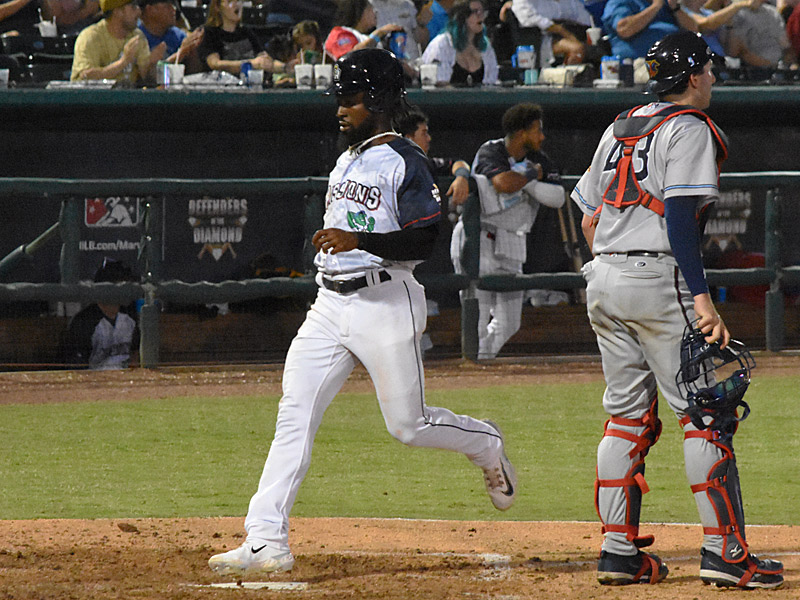 Daniel Johnson scores the go-ahead run in the sixth inning. The San Antonio Missions beat the Wichita Wind Surge 5-3 on Saturday, June 10, 2023, at Wolff Stadium. – photo by Joe Alexander