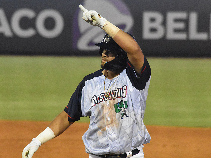 Pedro Castellanos points to the Missions’ dugout after driving in the go-ahead run in the sixth inning. The San Antonio Missions beat the Wichita Wind Surge 5-3 on Saturday, June 10, 2023, at Wolff Stadium. – photo by Joe Alexander