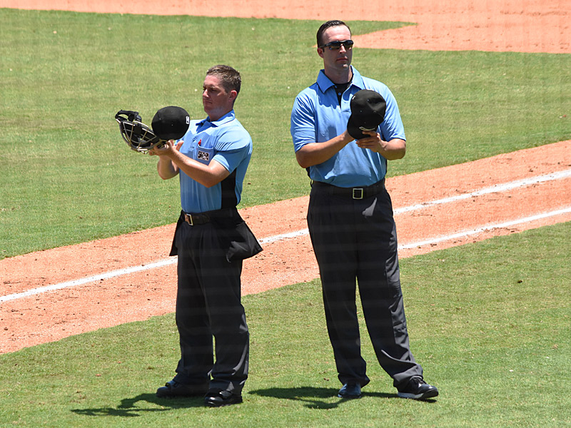 Umpires applaud as the Missions recognize members of the media between innings. The Wichita Wind Surge beat the San Antonio Missions 8-7 on Sunday, June 11, 2023, at Wolff Stadium. – photo by Joe Alexander
