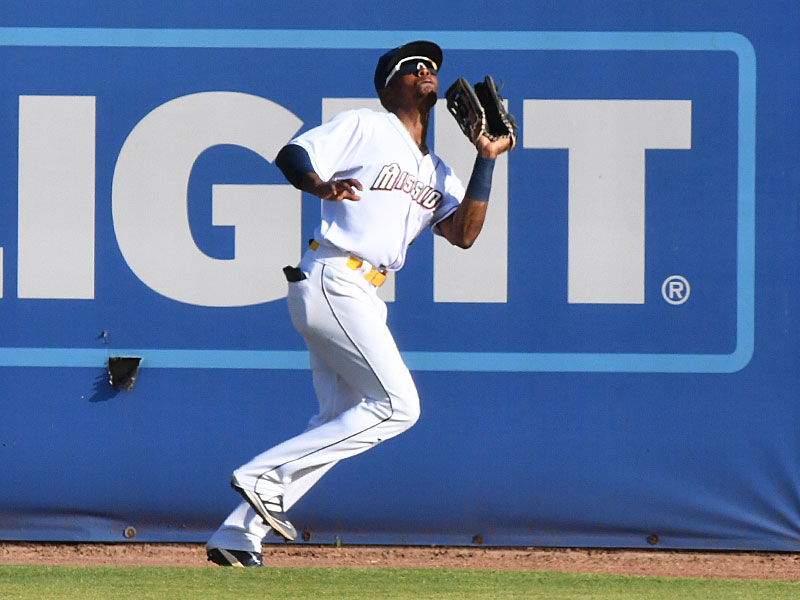 San Antonio Missions center fielder Esteury Ruiz gathers in a fly ball on Sunday at Wolff Stadium. – photo by Joe Alexander
