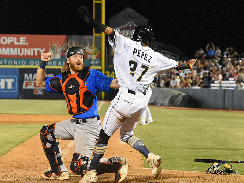 Jake Perez scores the winning run. The San Antonio Missions beat the Midland RockHounds 4-3 on a walk-off single by Tirso Ornelas in the ninth inning on Friday, June 23, 2023, at Wolff Stadium. – photo by Joe Alexander