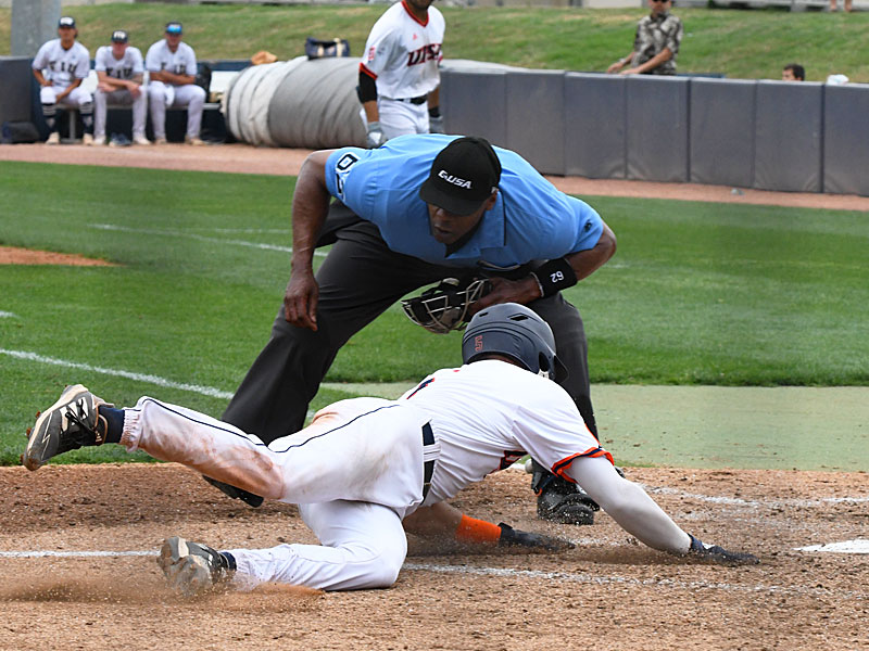 Josh Killeen slides safely into home. UTSA beat Florida International 9-8 on Sunday, April 24, 2022, at Roadrunner Field in San Antonio. – photo by Joe Alexander