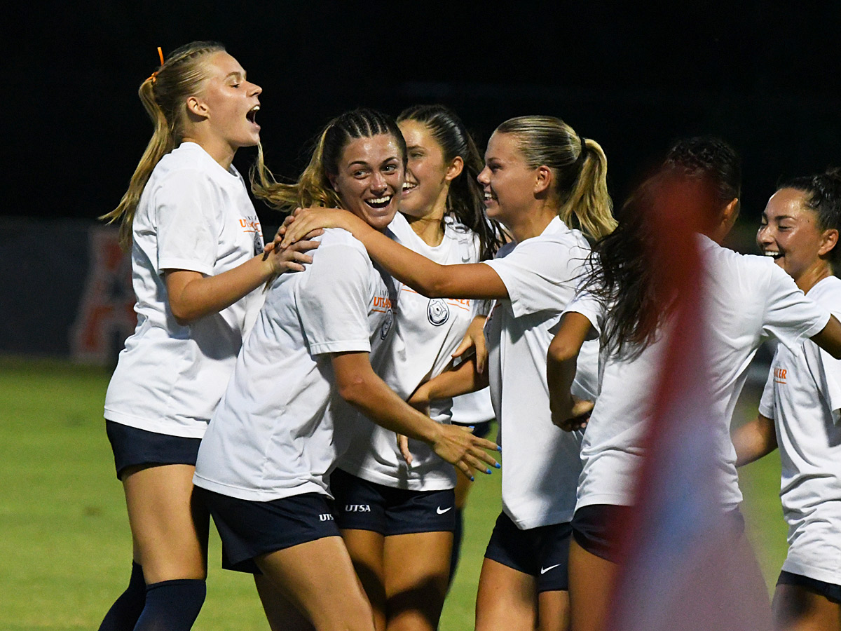 UTSA players celebrate after Brooklyn Bailey scored UTSA’s third goal in the 48th minute in a 6-0 exhibition victory over A&M-Corpus Christi on Sunday, Aug. 3, 2025, at Park West. – photo by Joe Alexander