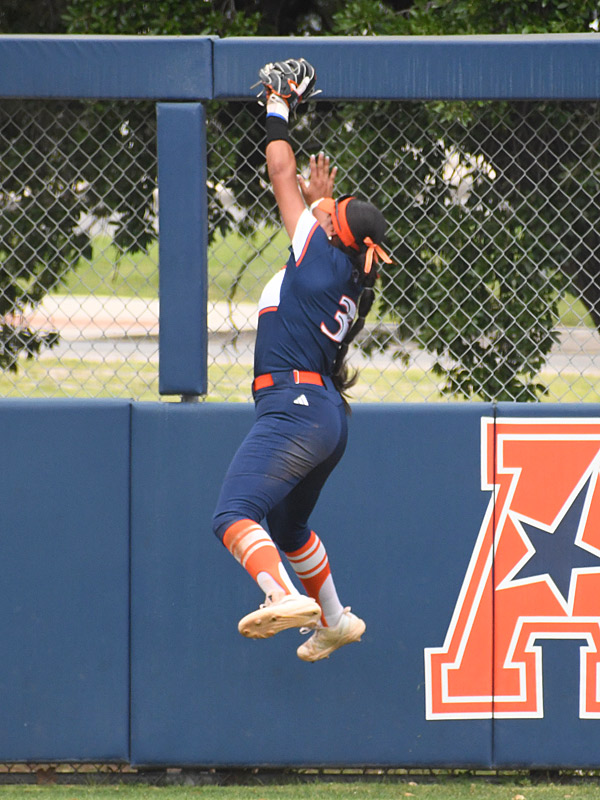 UTSA right fielder Crislyne Moreno makes a catch up against the fence during the Roadrunners’ 8-2 victory over A&M-Corpus Christi on Tuesday, April 22, 2025, at Roadrunner Softball Field. – photo by Joe Alexander