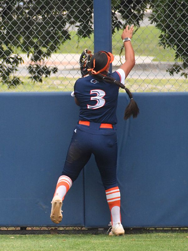 UTSA right fielder Crislyne Moreno makes a catch up against the fence during the Roadrunners’ 8-2 victory over A&M-Corpus Christi on Tuesday, April 22, 2025, at Roadrunner Softball Field. – photo by Joe Alexander