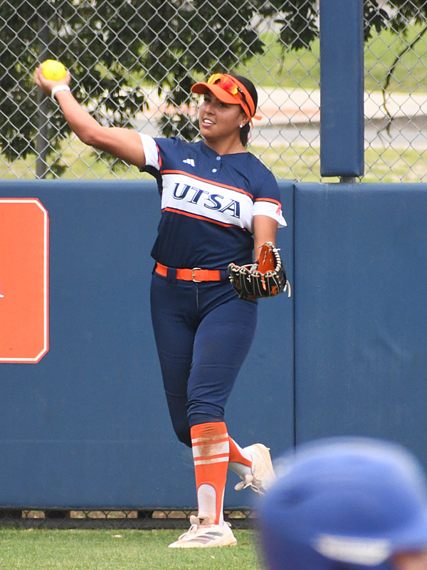 UTSA right fielder Crislyne Moreno makes a catch up against the fence during the Roadrunners’ 8-2 victory over A&M-Corpus Christi on Tuesday, April 22, 2025, at Roadrunner Softball Field. – photo by Joe Alexander