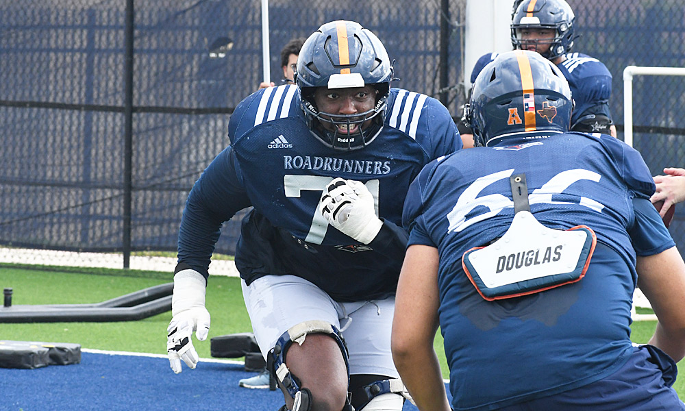 Jalen Garth goes through a UTSA spring football practice with the offensive lineman on Tuesday, April 22, 2025. – photo by Joe Alexander